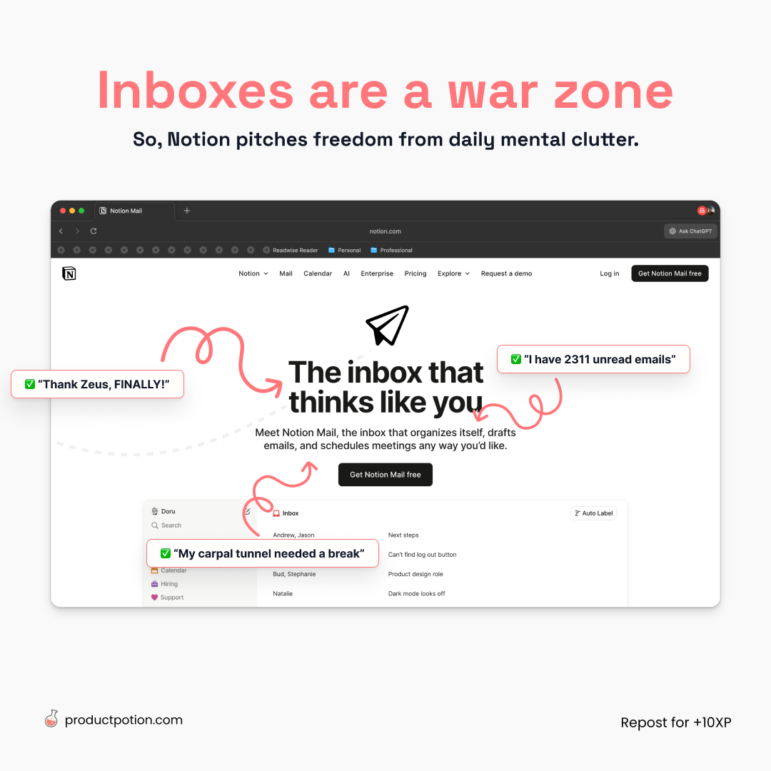 Inboxes are a war zone. Everyone is drowning in spam, or newsletters that are not as cool as us. It taxes your mind, emotions, and time. So, Notion doesn’t just pitch “better email.” They pitch sweet relief.