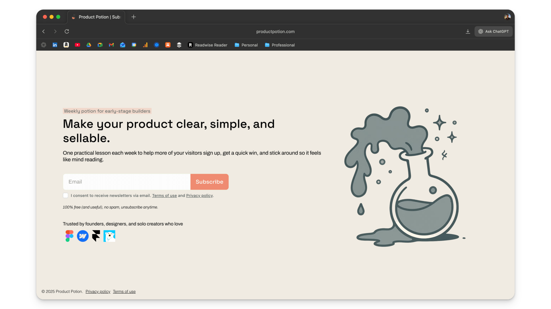 I tried to make it clear, simple, and sellable. The social proof logos, the clean design, and the straightforward promise all remove friction and make subscribing feel like a no-brainer. Feel free to reply and grill me.